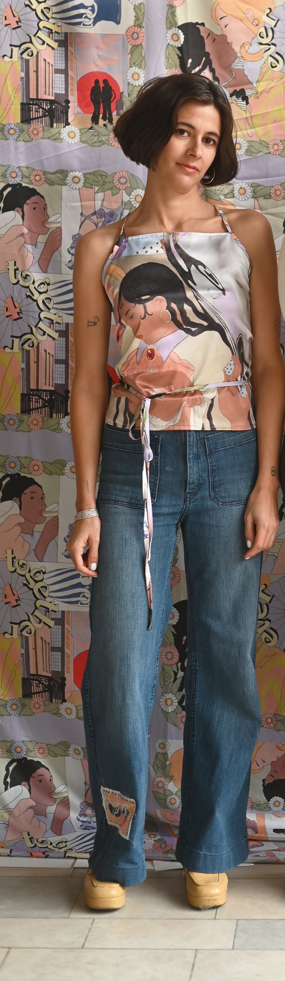 All items of this collection are meant to bring Melek’s world, it’s characters and their outfits into our lives and to let us carry her poetics on our bodies. The collection comprises of several pieces that are made with custom printed silk-fabric from scratch as well as thrifted pieces that were altered by us with small changes and silk-patches. Every piece was meticulously sewn and crafted by our own hands! We hope you love this collection as much as we do and we look forward to see you wearing it!