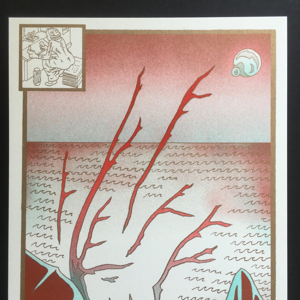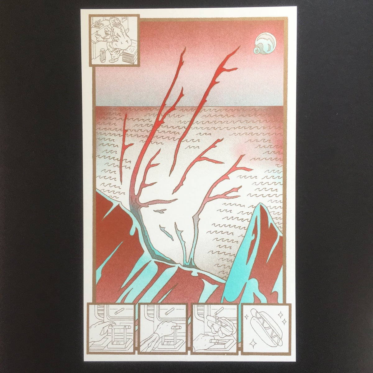 Published and printed by Colorama, 17x28cm, risoprint in metallic gold, crimson and mint on 300gsm Munken Pure Rough.