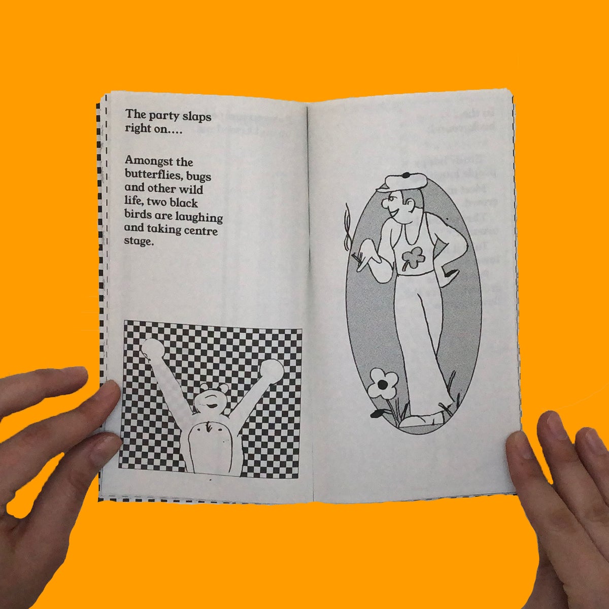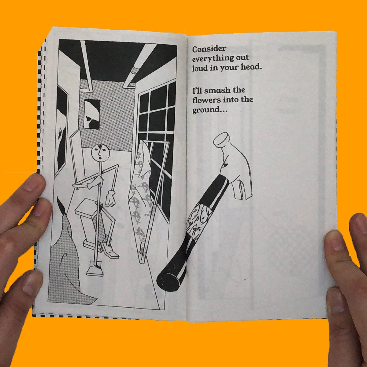 Published and printed by Colorama in April 2019, design and all artwork by Jack Taylor, 10,5x19,5cm, 38pages, risoprinted in black, perfect binding with glue and foldouts, first edition of 300 copies.