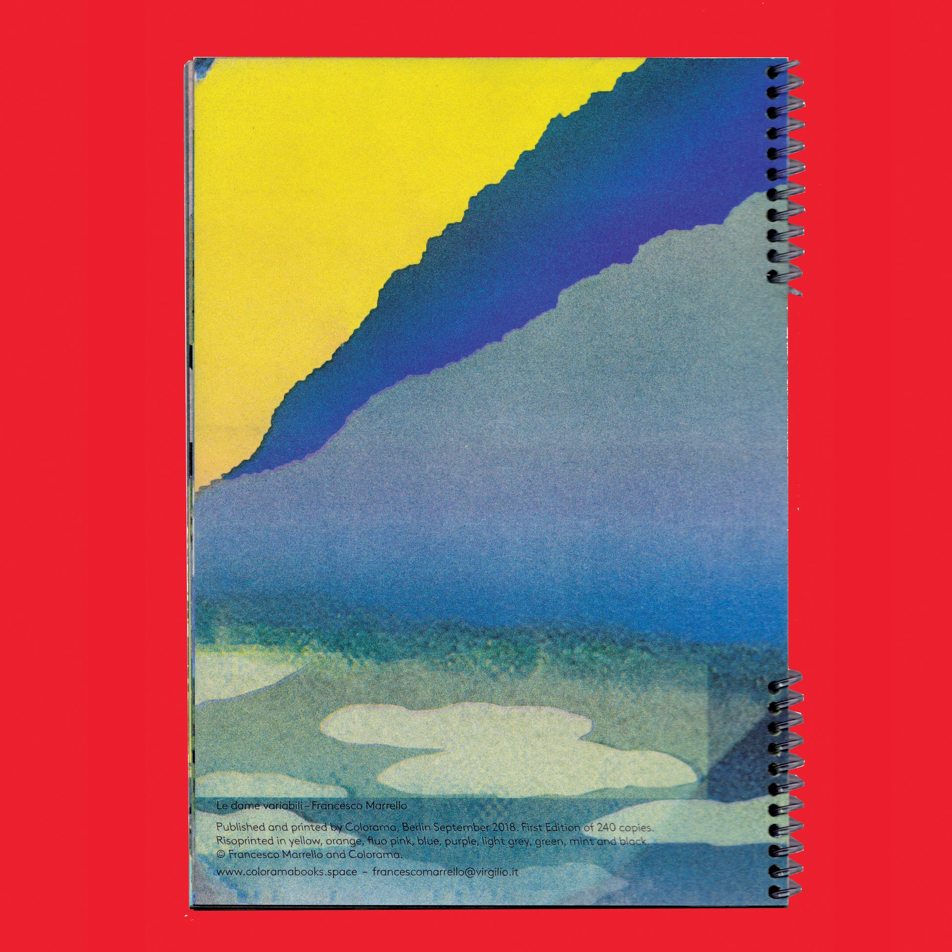 Drawings by Francesco Marrello, published and printed by Colorama, 17,5x25cm, 32 pages, risoprint in yellow, orange, fluo pink, blue, purple, light grey, mint and black on EOS 120g, spiral-bound, first edition of 240.