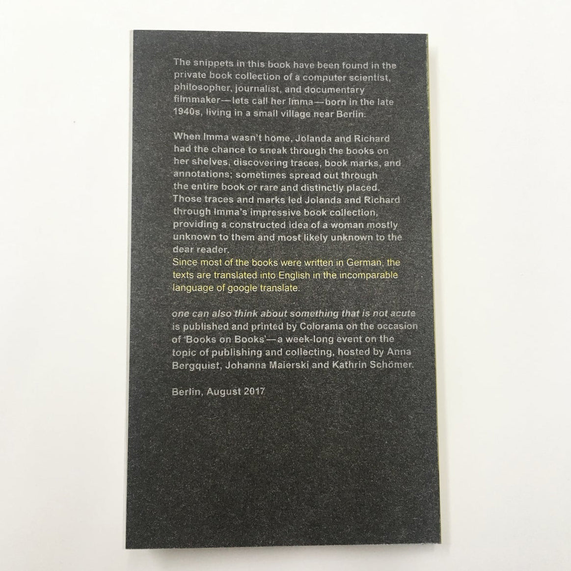 one can also think about something that is not acute is published and printed by Colorama on the occasion of 'BOOKS on BOOKS' – a week-long event on the topic of publishing and collecting, hosted by Anna Bergquist, Johanna Maierski and Kathrin Schömer.