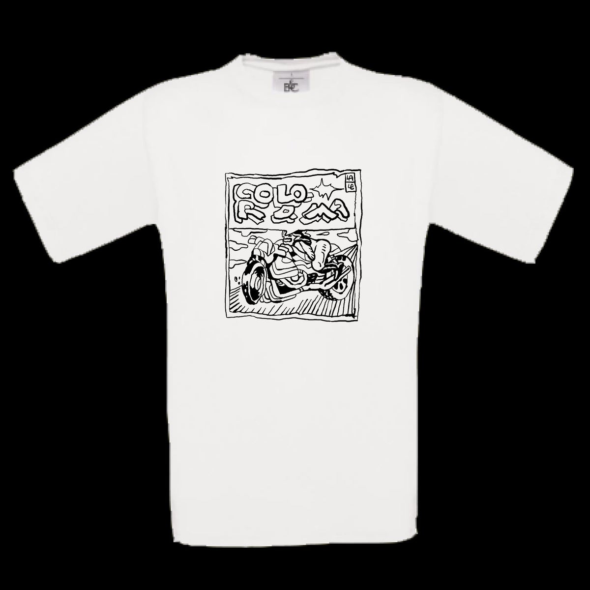 The t-shirt by Lale Westvind is silkscreen-printed in black on a white t-shirt.