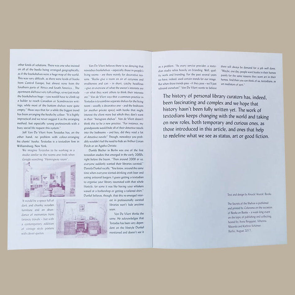 Published and printed by Colorama on the occasion of 'Books on Books' – a week-long event on the topic of publishing and collecting, hosted by Anna Bergquist, Johanna Maierski and Kathrin Schömer. Berlin, August 2017.