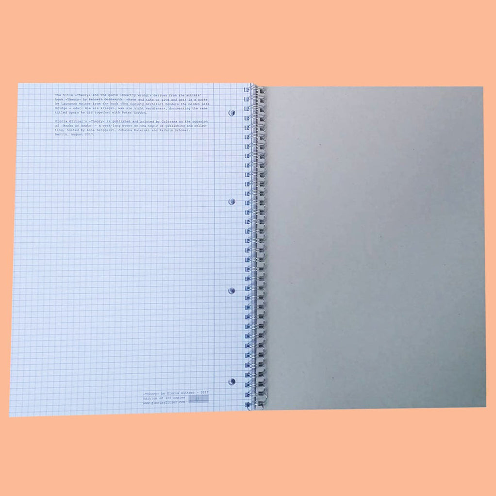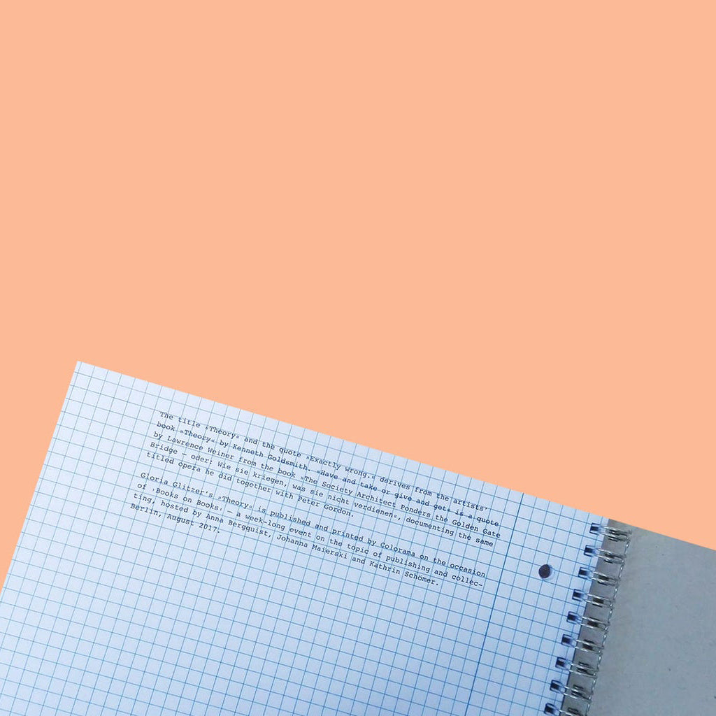 Gloria Glitzer's 'Theory' is published and printed by Colorama on the occasion of 'Books on Books' – we week-long event on the topic of publishing and collecting, hosted by Anna Bergquist, Johanna Maierski and Kathrin Schömer.